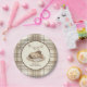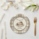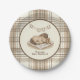Set a charming table for your celebration with these western-themed baby shower paper plates. The design centers on a sweet watercolor foal sleeping next to tiny cowboy boots, framed by a classic tan and white plaid border and a delicate horseshoe banner. These customizable plates are ideal for a "Little Cowboy" theme or any rustic country baby shower.