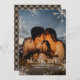 Easily personalise this romantic winter wedding photo save the date card featuring falling snow, sparling snowflakes and a khaki buffalo plaid pattern. THIS CARD WORKS BEST WITH DARK PHOTOS.