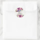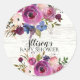 Pretty baby shower favour seal featuring a watercolor plum & blue floral bouquet set on a rustic wood background