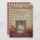 Vintage memorial announcement featuring a field of poppies, printed to look weathered and vintage. Elegant fonts in dark burgundy. The back features a dark red gingham pattern. Add a photo of your loved one too.