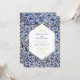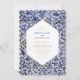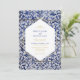 This design features rustic Portuguese tile patterns. The wedding text is elegantly framed with a white and gold colour geometric shape. Unique Azulejo blue and white floral wedding invitation design with modern elements. Matching wedding stationery items and other wedding invite formats are also available.