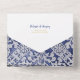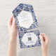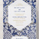 This design features rustic Portuguese tile patterns. The wedding text is elegantly framed with a white and gold colour geometric shape. Unique Azulejo blue and white floral wedding invitation design with modern elements. Matching wedding stationery items and other wedding invite formats are also available.