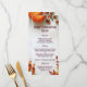 Elegant fall dinner menu template card featuring a rustic whimsical design with colourful fall leaves and pumpkins. Although set for Thanksgiving, this card can be customised for any fall or autumn dinner occasion.