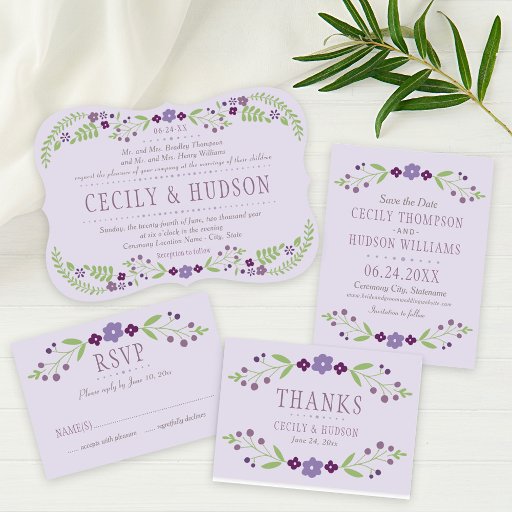Rustic chic wedding thank you note cards feature a symmetrical floral frame of lilac, lavender, violet, and plum purple flowers and green botanical leaves with hand-drawn look. Flat card format includes space on the back for a handwritten message.