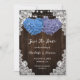 Romantic rustic purple and blue floral wedding save the date card featuring hydrangea flowers against a barn wood background adorned with white floral lace and string lights. Matching items available.
