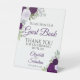 This beautiful pedestal sign will invite your wedding guests to sign your guest book. Features a rustic boho floral design with hand painted watercolor roses in shades of purple, plum, lavender, and lilac. There is space for the names of the couple as well as the wedding date.