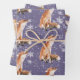 A rustic purple grape color holiday wrapping paper sheet set featuring watercolour-painted winter animals: a doe reindeer, a hare rabbit and a red fox experiencing their first snowfall in a repeat pattern on a warm vintage muted purple grape color background.