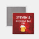 A birthday party keepsake commemorative magnet. Customise with your details. The background is a deep red grunge style painted texture background with thick brushstrokes, scrapes and scratches. A bright candy coloured red layered over a dark ruby red colour. A frothy beer mug illustration displayed underneath the text.
