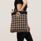 The background on this lumberjack style tote bag is a red , tan, and black variation on the popular buffalo plaid pattern. At the top centre is a tan circle banner with a matching red moose image, placed on a black top border. The back of the bag has the same pattern and images.