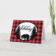 A rustic holiday Christmas card features a red and black buffalo plaid background. In the centre is a white oval with black trim. Inside of the oval is a black silhouette of two pine tree and in the centre is the silhouette of a bear. Above the bear and between the pine tree is text in black font that says Happy Holidays, however the text is customisable. The inside of the card has customisable text in black and red font where you can add your own Christmas or holiday verse as well as your name or delete it all for a blank card perfect for hand writing your own message.