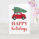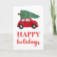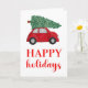 This beautiful holiday greeting card features an illustration of a vintage style red car with a Christmas tree on top, with with the words Happy Holidays and a custom message on the inside.