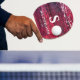 This modern, rustic design features a faux deep red wooden backdrop with string lights and classic typography, Customise the ping pong paddles with your family's monogram and name for personalisation and show everyone who rules at table tennis.