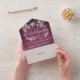 All in one wedding invitation featuring pretty string lights, hand-drawn floral garland and chic typography on a rustic burgundy red wood panels background. The invitation includes a perforated RSVP card that can be individually addressed or left blank for you to handwrite your guest's address details. Designed by Thisisnotme©