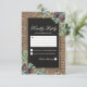 Rustic winter wedding response card featuring a rustic wood background, black chalkboard centrepiece, rope, christmas pine cones, berries, foliage, white splatterings of snow and a personalised rsvp template.