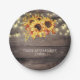 Rustic retirement party paper plates with watercolor sunflowers and string lights on a wood background. Rustic festive style for your celebration.