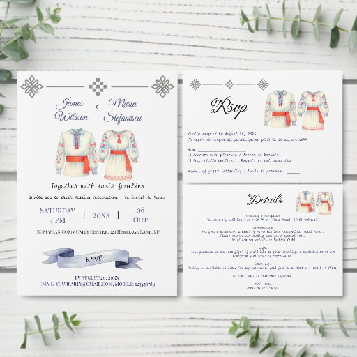 Celebrate your heritage with this elegant Romanian wedding invitation featuring traditional folk costumes – the iconic “ie” blouse and embroidered shirt. Perfect for ethnic weddings, multicultural ceremonies, or couples with Romanian roots, this rustic yet refined design brings together tradition and love. Fully customisable with names, date, location, and RSVP details. Ideal for weddings held in community centres, countryside venues, or cultural-themed settings. Matching RSVP cards and wedding stationery available in our full collection.
