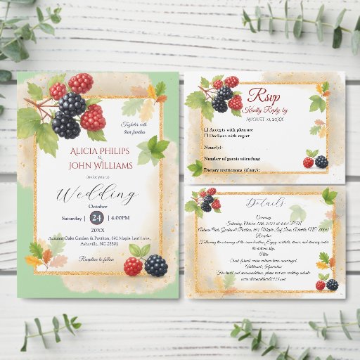 Celebrate your love with this elegant rustic autumn wedding invitation, featuring hand-painted blackberries, raspberries, and seasonal oak leaves in warm fall tones. A shimmering faux gold frame surrounds your wedding details, giving the design a luxurious touch. Perfect for outdoor garden weddings, vineyard celebrations, or rustic barn receptions in the fall season.