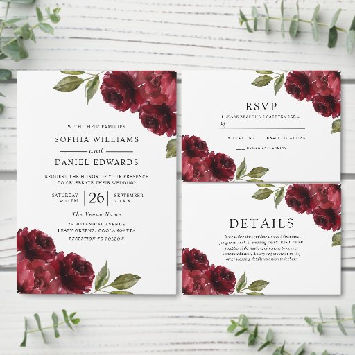 Rustic Romantic Burgundy Red Rose Wedding Invitation