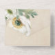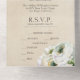 This vintage style romantic floral wedding invitation features an all-in-one design with an R.S.V.P. card included at the bottom. The background is a rustic parchment paper design that resembles an old vintage book, with watercolor ranunculus flowers. A delicate bouquet of ranunculus and greenery is pictured on the front flap, and two on the inside portion.