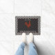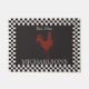 Show your family pride right at your front door with this rustic black, rusty red and white monogram door mat design featuring a black and white check border with a dark red rooster in centre. Personalise with your family name and year established. Design by Holiday Hearts Designs (rights reserved).