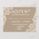 Nothing says romance like lace! This charming lacy RSVP card features a white floral lace pattern bordering your wedding / party information printed in complementing romantic cursive and bold white fonts highlighted against a creamy brown tan background.