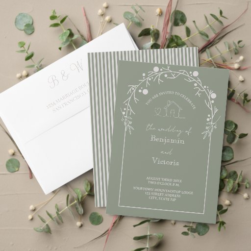 Celebrate your special day with this elegant and modern wedding invitation. Featuring a delicate botanical line art arch and a charming hand-drawn cottage heart illustration, this design perfectly blends rustic warmth with sophisticated style. The trendy sage green background and clean white typography create a fresh, timeless look suitable for garden, country, or outdoor weddings. All text is fully customisable, allowing you to easily add your own details for a truly personal touch.