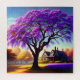 Pictured in a oil paint design is a wonderful blooming Jacaranda tree with a old homestead in the background