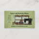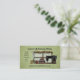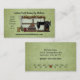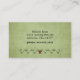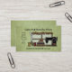 Prim rustic business card for sewing and quilting artisans with cutely detailed graphics scene of a vintage sewing machine, stacks of fabric, scissors and thread in front of a widow. Created on a green mottled vintage look background in part with purchased art from digiwebstudio.com. Customise all text in the simple online Zazzle form.