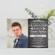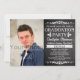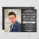 Add a photo for a fresh and hip trendy chalkboard themed 2-sided flat graduation party invitation, just like the old school blackboard. Personalise this cool holiday card with your name and year. Rustic and vintage slate chalkboard black board theme is great for celebration. dark charcoal grey and black background with white chalk look lettering and antique theme decos.