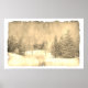 A pretty, vintage, winter nature scene of evergreens in the snow on aged parchment paper. Done in brown, gold and white.