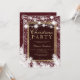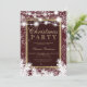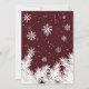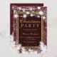 A rustic winter Christmas party with snowflakes illustration, white string lights with white pine tree branches on red background with an elegant script typography.