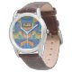 An ethnic look with a southwest palette of orange, blue, teal and sand combined in irregular patches or tiles. A fun tribal design to pair with a rustic leather strap.