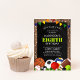 These birthday invites are a game changer! Fun colourful sports themed birthday party invitations, featuring a rustic wooden and black chalkboard background, decorated with tiny white stars, a rainbow banner, green grass and array of sports equiptment (football, volleyball, basketball, hockey puck, rugby ball, tennis ball, snooker ball, golf ball, and even a ping pong ball!). The modern template is easy to personalise. To change the text colour, font or size just click 'customise further'. This invitation is perfect for any age, any gender and any sports themed party.