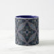 With the rich tones of aged wood, stone, and weathered rooftops, this mug features a kaleidoscopic starburst pattern made from architectural textures. Muted browns, deep greens, slate greys, and sky blues form a rustic yet structured mandala that feels both handcrafted and geometric. The deep navy interior and handle create a calming contrast, perfect for quiet mornings, cosy cabins, or those who love natural textures and symmetry.