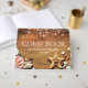 Beach destination wedding guest book featuring a rustic wood barn background, twinkle string lights, sandy beach with a starfish and seashells.