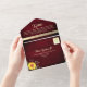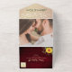 Celebrate love’s timeless charm with this enchanting all-in-one wedding invitation, blending rustic warmth and modern elegance. Designed on barn wood-inspired burgundy paper, it features shimmering golden floral lace and the soft glow of string lights, creating a cosy yet sophisticated atmosphere. Radiant sunflowers add a joyful, symbolic touch, while a custom photo of the couple on the back makes it deeply personal and memorable.