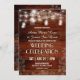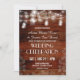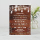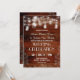 Trendy elegant invitation features mason jars, string lights, eucalyptus overlay over rustic wood grain background. Click to customise further to change font style or add more text to suit your needs.