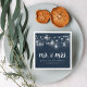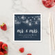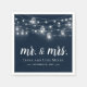 Affordable custom printed paper napkins for your wedding or any event. The design features rustic glowing string lights and mason jars hanging across the top with a mix of modern and calligraphy script fonts on a navy blue background. Personalise it with your Mr. and Mrs. monogram and wedding date or other custom text. Use the design tools to choose any background colour, edit the text fonts and colours or upload your own photos.