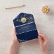 Create a magical first impression with this elegant all-in-one winter wedding invitation. Featuring a rich navy wood background, soft glowing string lights, and golden floral illustrations, this design sets the tone for a romantic, cosy celebration. Includes RSVP details with a QR code for convenience, and folds into a chic, matching envelope. Perfect for barn weddings, winter ceremonies, or rustic evening events.