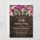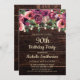 90th birthday party country-style invitation for women with a rustic dark brown barn wood background with twinkling string lights, and pink and purple watercolor floral. The text on this invitation is fully customisable, so regardless of the age, it can be personalised perfectly. Contact us for help with customisation or matching products.