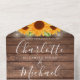 All in one wedding invitation with pretty sunflowers, string lights, signature style names and chic typography on a rustic wood background. The invitation includes a perforated RSVP card with your wedding website QR code and details. Designed by Thisisnotme©