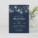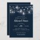 Affordable custom printed wedding rehearsal dinner invitations with an easy to use template for customisation. This rustic chic design features strands of glowing string lights and mason jars on a dark navy blue background. Personalise the invite with your rehearsal dinner party details or customise the text to use for any event. Use the design tools to choose any background colour, add photos and customise the text fonts and colours to make a unique design for your wedding rehearsal party.