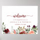 This rustic summer floral engagement party welcome poster is perfect for a modern engagement celebration. The design features burgundy, pink and blush watercolor flowers with green leaves in a brownish stained background.