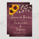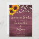 Invite friends and family to your rustic wedding! This beautiful save the date card depicts a sunflower, burgundy wood background and string lights. Customise with the your names, wedding date, and preferred wording. See other items in this collection with this rustic wood sunflower design.