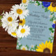 Rustic country birthday invitation featuring vibrant sunflowers, traditional white daisies and navy blue flowers against a blue background with baby's breath and botanical greenery accents