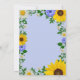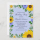 Rustic country birthday invitation featuring vibrant sunflowers, traditional white daisies and light blue flowers against a light blue background with baby's breath and botanical greenery accents