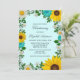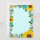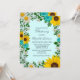 Rustic country christening invitation featuring vibrant sunflowers, traditional white daisies and teal flowers against a light aqua background with baby's breath and botanical greenery accents
