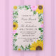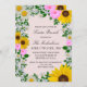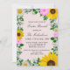Rustic country Easter invitation featuring vibrant sunflowers, traditional white daisies and pink flowers against a light pink background with baby's breath and botanical greenery accents