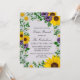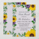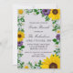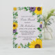 Rustic country Easter invitation featuring vibrant sunflowers, traditional white daisies and colourful purple flowers against a light purple background with baby's breath and botanical greenery accents