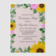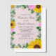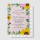 Rustic country graduation party invitation featuring vibrant sunflowers, traditional white daisies and pink flowers against a light pink background with baby's breath and botanical greenery accents